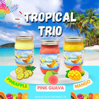 The Tropical Trio is a vacation in a bundle — featuring Pineapple, Mango, and Pink Guava Sea Moss Gels for those who crave bold, exotic flavor with serious wellness benefits. Packed with vitamin C, antioxidants, and 92 essential minerals, this trio supports hydration, digestion, skin health, and immune strength. Smooth, vibrant, and sun-kissed in taste, this bundle delivers island energy all week long — with extra value when you bundle.
